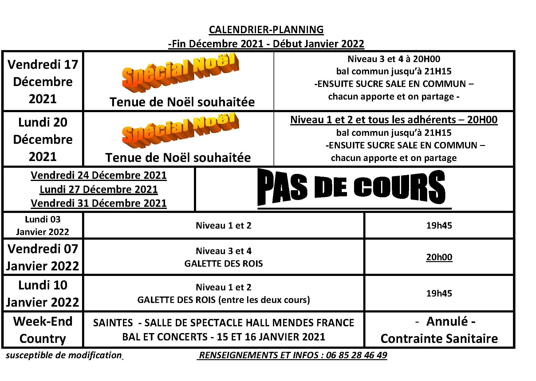 - Quelques infos pour concernant le planning de fin d’année . – Planning des cours pendant les fêtes avec les deux soirées sucré salé "Spécial Noël "