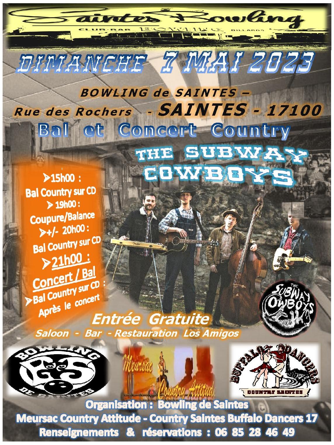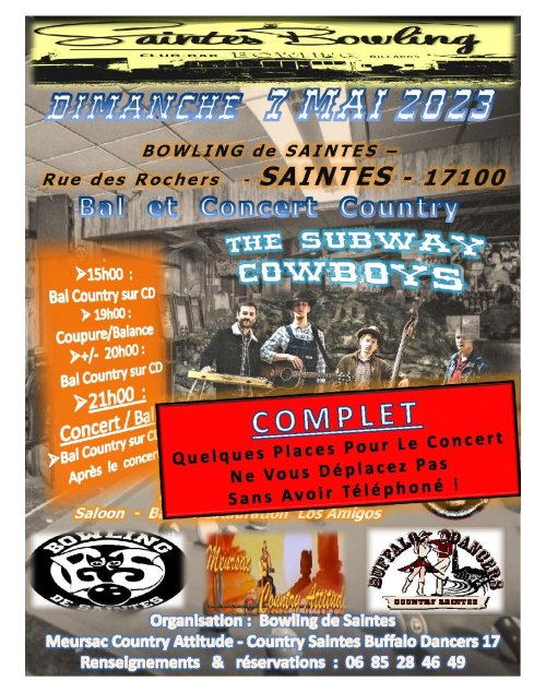 –Info du 14 avril 2023 – Après cette superbe journée à meursac avec le groupe Country Pie (voir toutes les photos dans la page photos) , place à notre nouvelle journée country le dimanche 07 mai 2023 au bowling de Saintes(17) avec dès 15h00 le bal country sur CD et en point d’orgue à 21h00 le concert de The Subway Cowboys . Et bien sur toute la journée et même après le concert bal country.