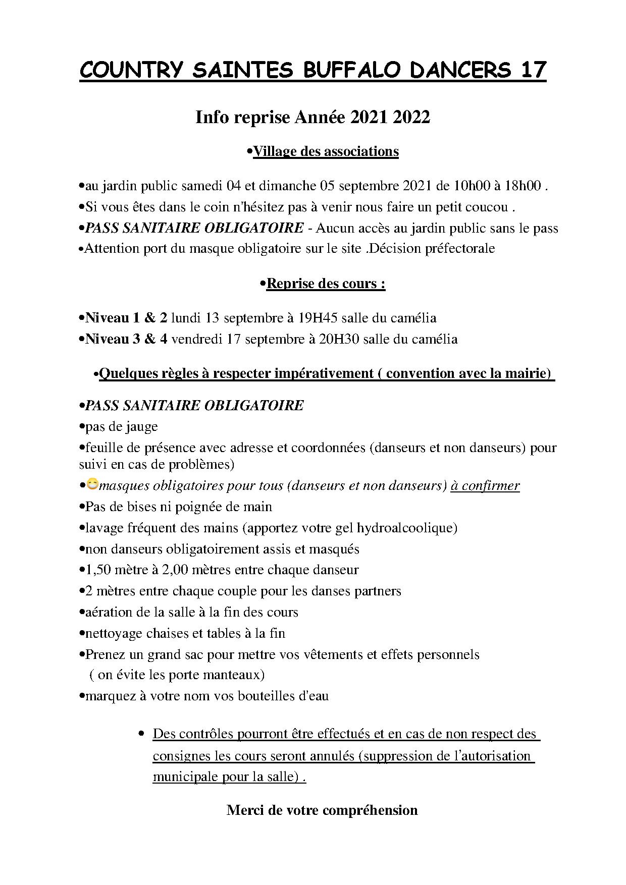 – Coucou les Buffalo’s , les dernières infos concernant la reprise des cours lundi 13 septembre ou vendredi 17 septembre salle du camélia