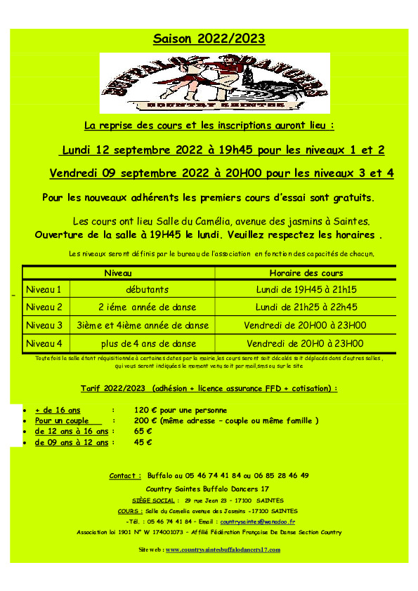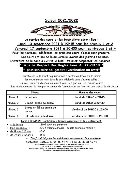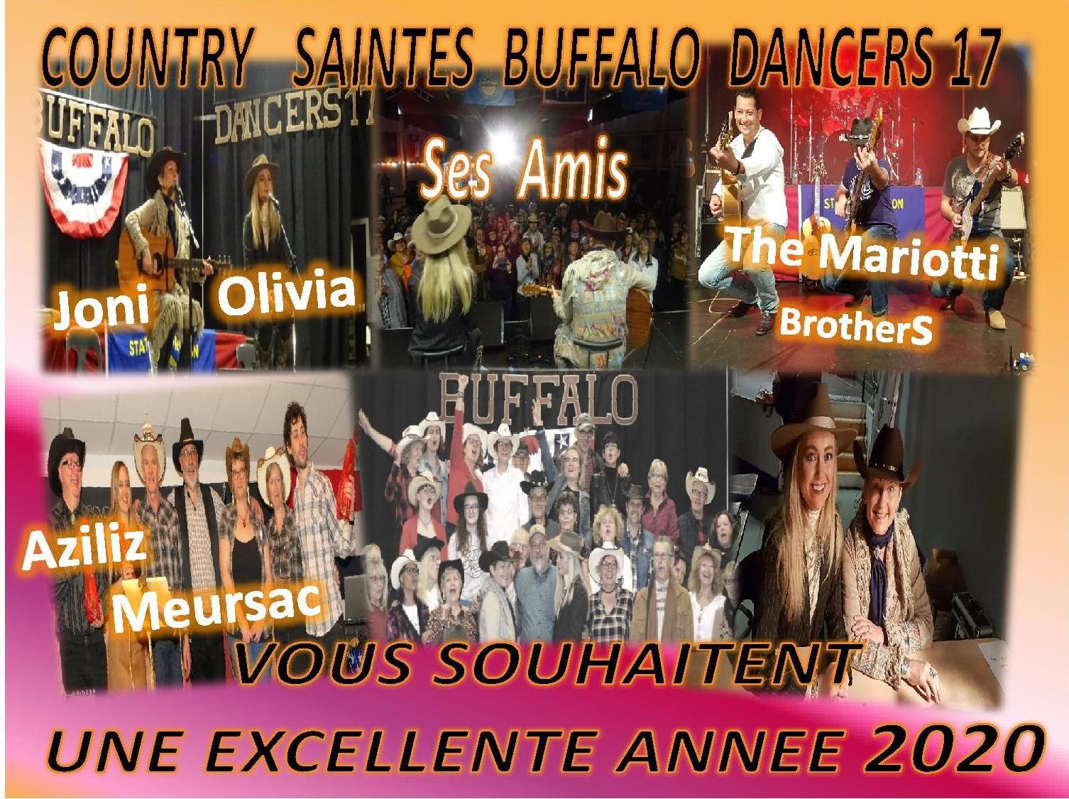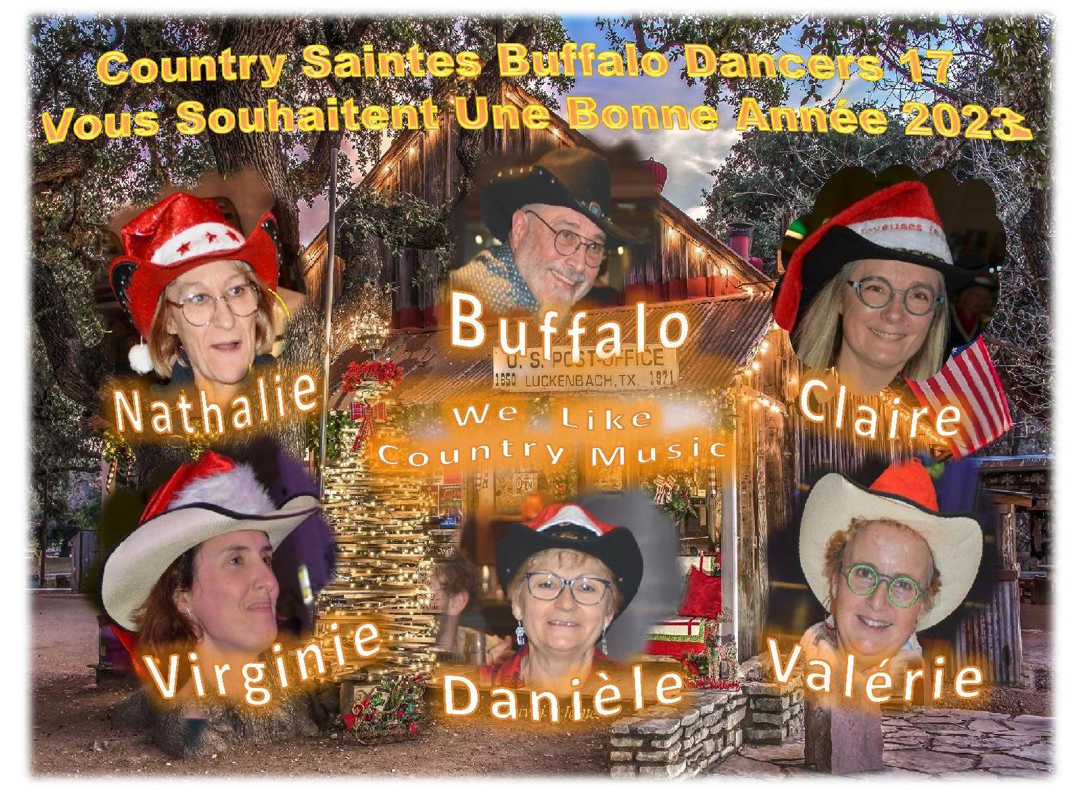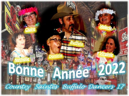 – En ce début de nouvelle année , Country Saintes Buffalo Dancers 17 par l’intermédiaire de ses quatre animatrices : Claire , Nathalie , Valérie et Virginie , de Danièle et de moi même Buffalo , vous présente ses meilleurs voeux pour l’année 2022 . En espérant que celle ci soit meilleure que les précédentes et nous apporte tout ce qui nous manque depuis 2 ans : Musique , Concerts , danses , bals , convivialité et partage .
