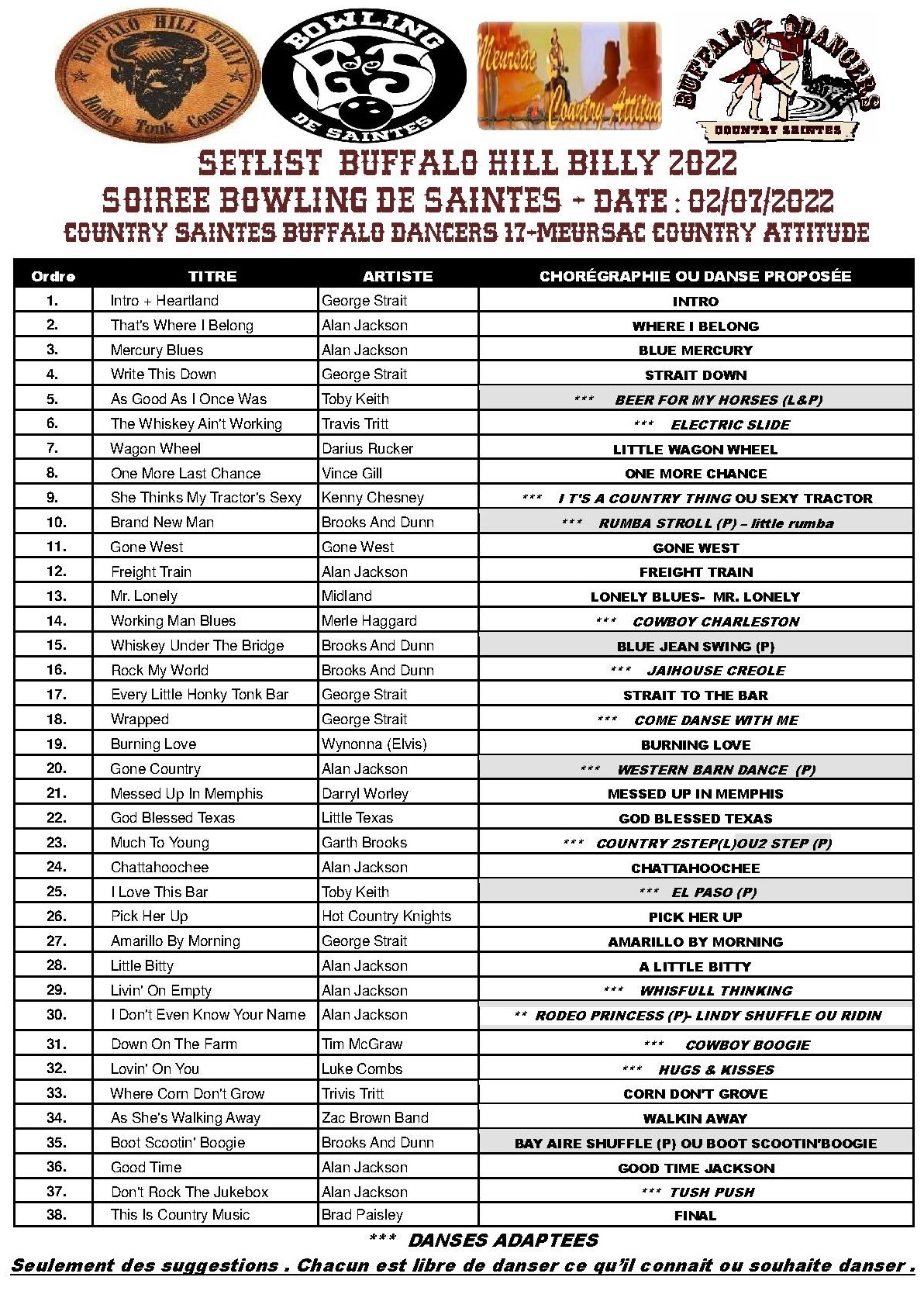 – Vous allez pouvoir réviser pour la journée country au bowling de saintes le 02 juillet 2022, voici la playliste CD ainsi que la playliste pour le concert/bal du groupe Buffalo Hillbilly et l’affiche .