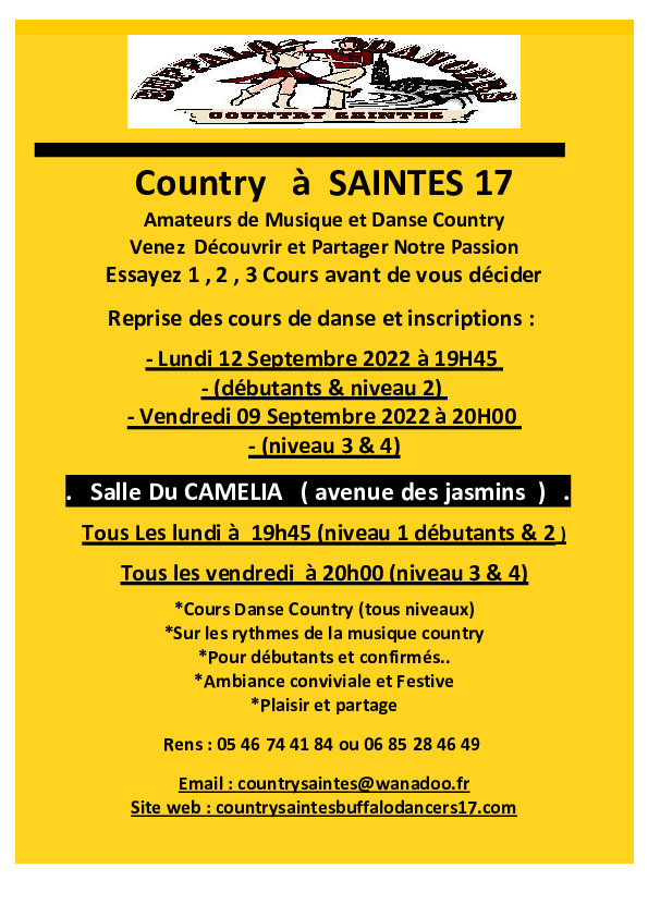 Pour info nos prochains RDV : samedi 07 et dimanche 08 septembre , salon des associations a saintes parc des expos. samedi 12 octobre animation bal country a brizambourg . samedi 09 novembre animation bal country et concert avec Aziliz a Gemozac . samedi 23 novembre notre 13ieme soirée country a saintes parc des expositions. Info du 23 juillet 2019 Coucou les vacanciers ,alors ces vacances country se passent bien . Pour (…)