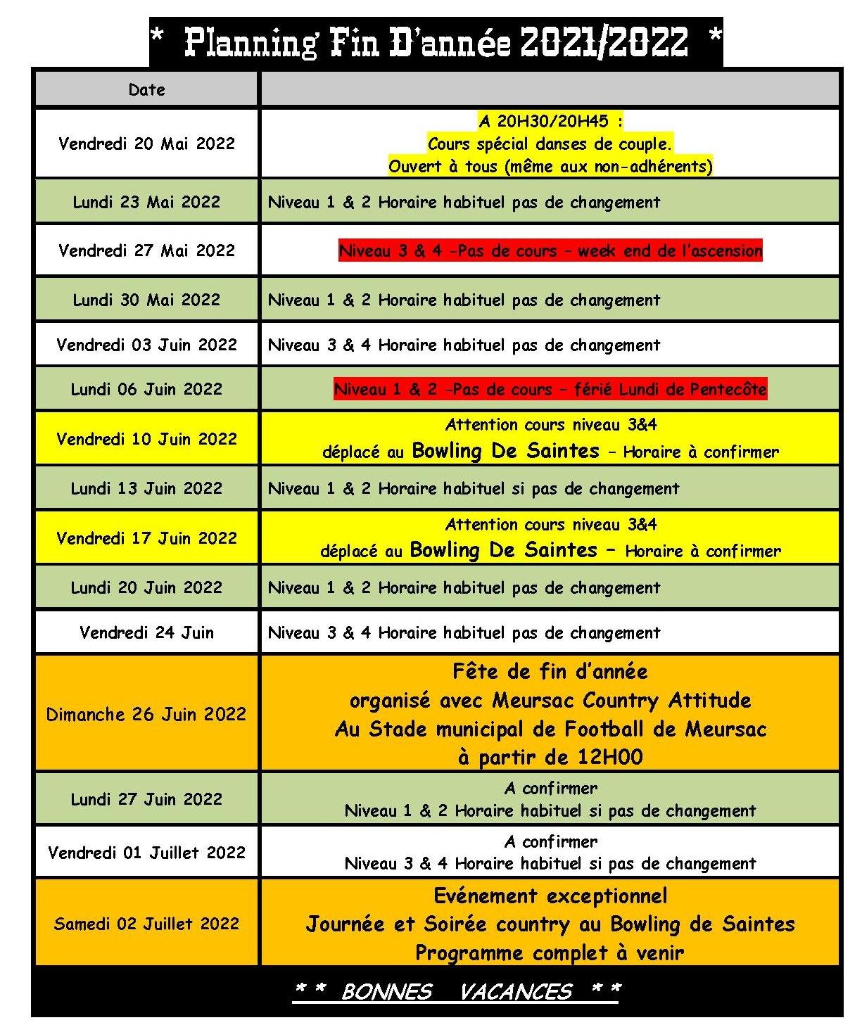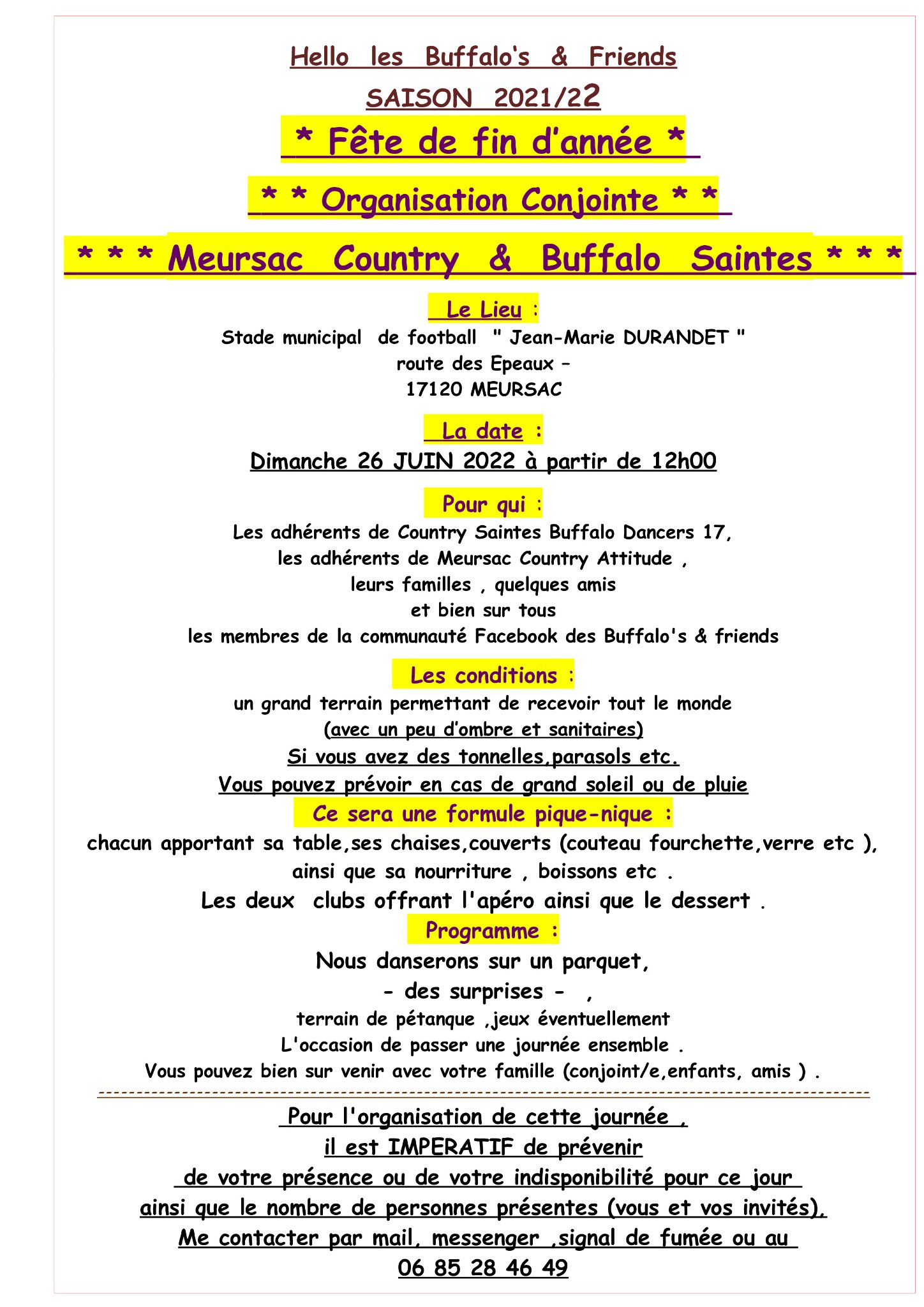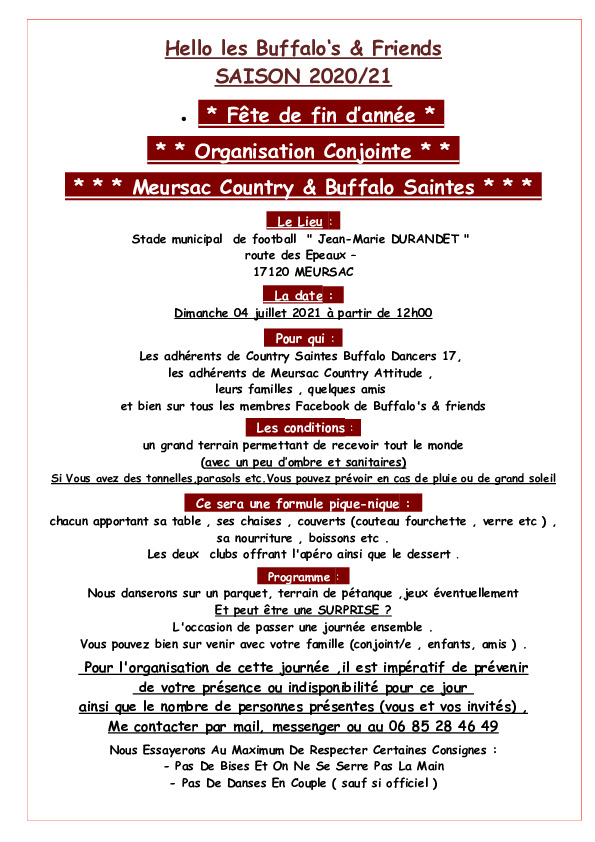 – La fête de fin d’année aura lieu le dimanche 26 juin 2022 à Meursac comme l’an passé co organisé avec nos amis de Meursac Country Attitude