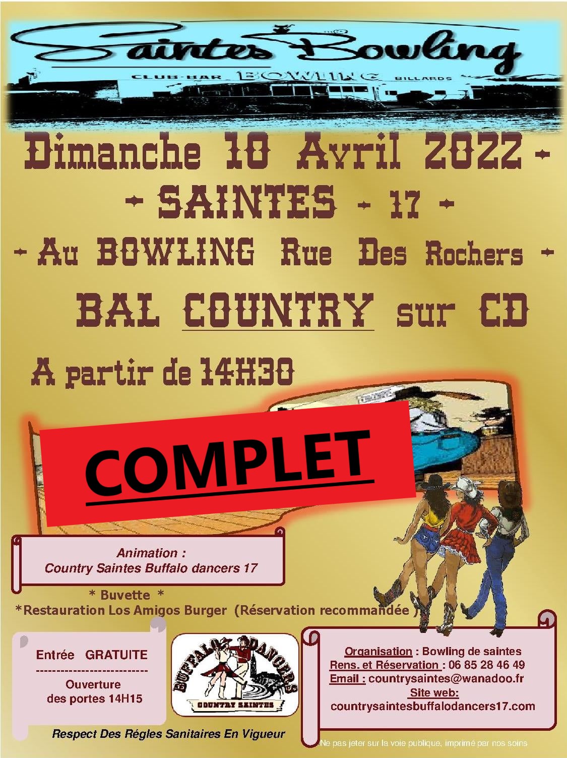– le bal country du samedi après-midi COMPLET COMPLET – la journée complète du samedi il reste quelques places (une dizaine à la minute non 9) mais dépêchez vous et surtout téléphonez (05 46 74 41 84) avant de vous déplacer car d’ici à samedi cela sera COMPLET.