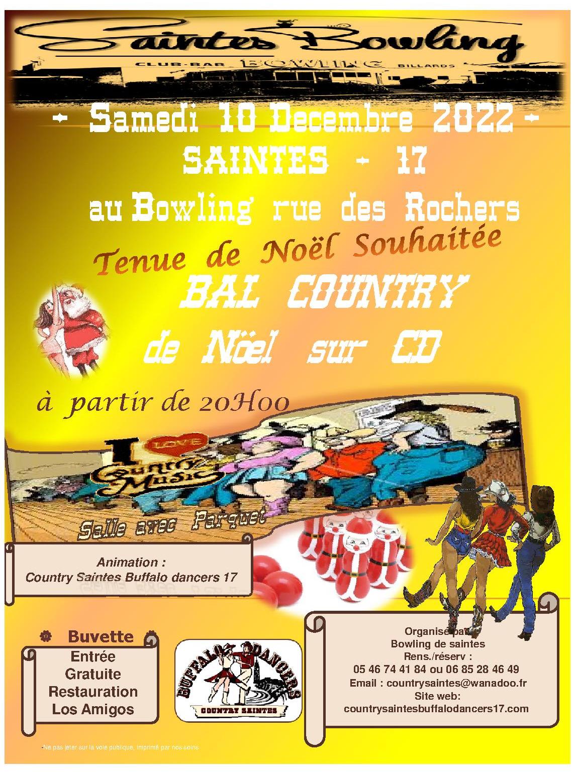 –Info du 21 Octobre 2022 – Après une reprise de la saison 2022/2023 avec beaucoup de nouvelles têtes mais aussi le retour de quelques anciens nous avons le plaisir de vous annoncer le retour de notre traditionnel bal de Noël dans notre honky tonk préféré Le Bowling de Saintes et ce sera le SAMEDI 10 DECEMBRE 2022