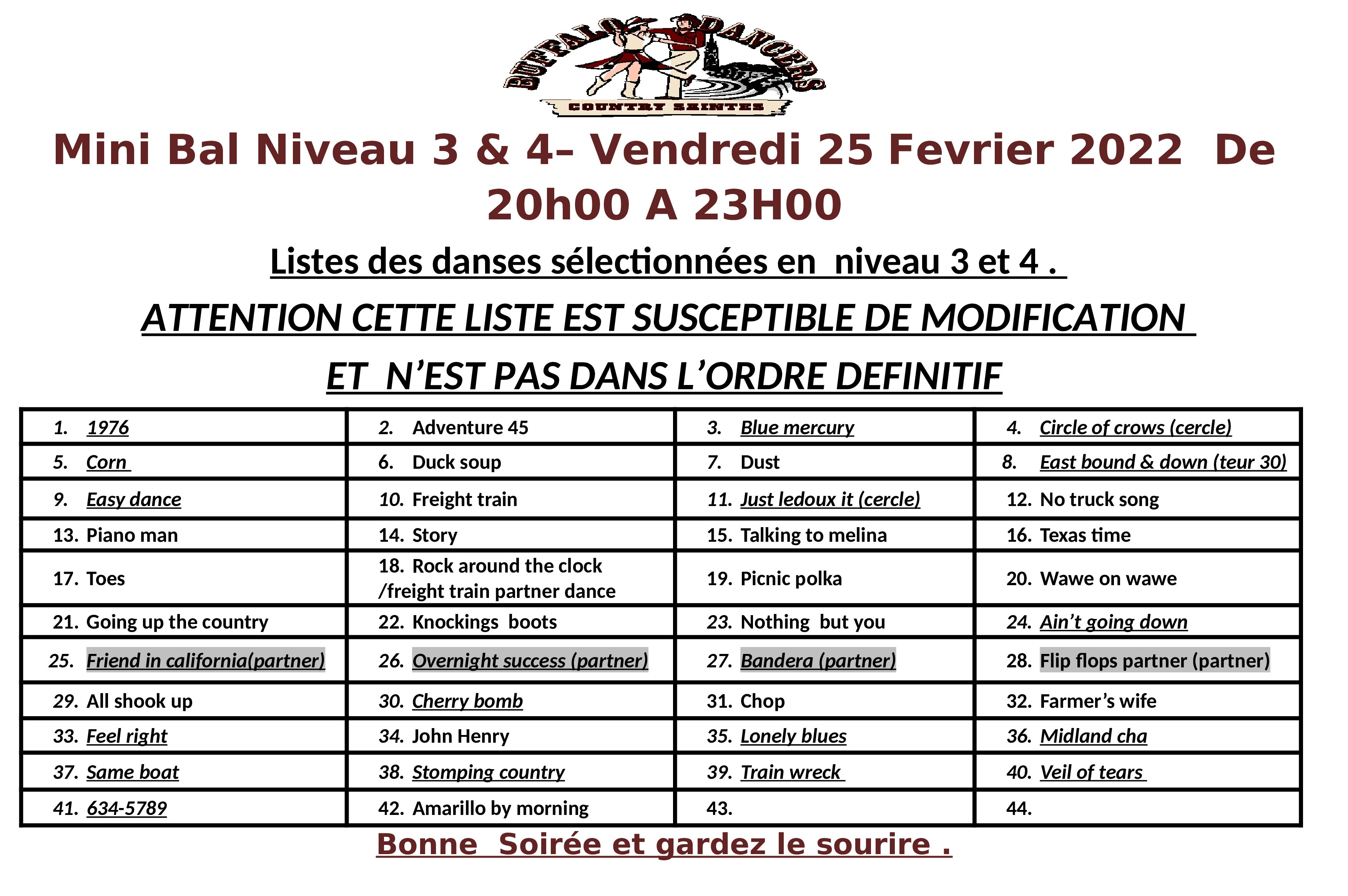 Tout d’abord celle que vous attendiez tous : la playliste . Et toujours un mélange pour tous les niveaux des débutants aux danseurs plus confirmés . Des danses incontournables , celles que l’on aime toujours , des soi disant anciennes mais que les nouveaux danseurs ont plaisir à découvrir (et oui pour eux ce sont des nouvelles ) , mais aussi plus récentes ,des nouvelles , des coups de coeur mais surtout de la musique country et que de la country musique .