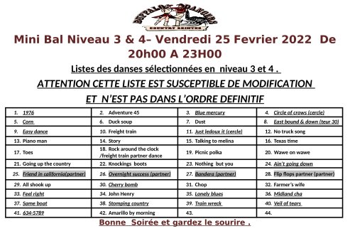 –Vendredi 25 février : niveau 3 et 4 mini bal en commun de 20h00 à 23h00 (ouvert à tous ) au camélia - attention pass vaccinal toujours de rigueur