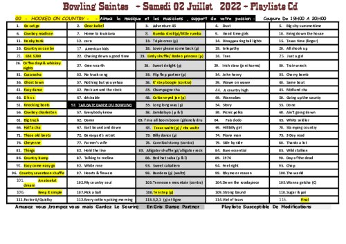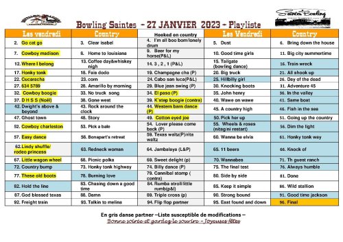– Et voici la playliste de notre premier vendredi country le 27 Janvier 2023 au Bowling de Saintes à 20h30 :