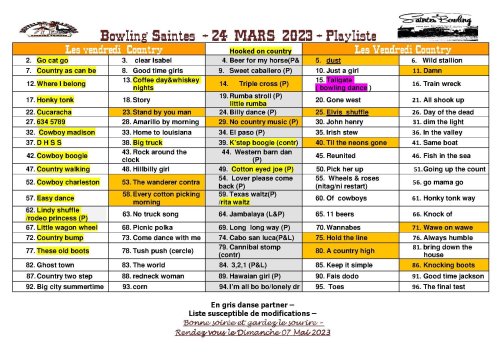 –Info du 22 avril 2023 – Et voici la playliste pour la journée country du 07 mai 2023 au bowling de Saintes