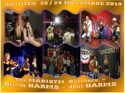 – Samedi 23 et dimanche 24 Novembre 2018 nous organisons notre 13ième journée country à Saintes (17) parc des expositions avec en concert l’un des meilleurs groupe français les "Mariotti Brothers (présentation nouvel album Summer song ) une carrière de près de 20 ans et le retour à Saintes à votre demande de Madame Joni HARMS en exclusivité française . De plus elle sera en concert avec sa fille Olivia (la reléve est assurée ) . Et nouveautée pour cette année deuxième prestation de joni et olivia HARMS le dimanche matin à 11h00 , mais en concert acoustique ( intimité ,convivialité et émotion seront au rendez vous ) , elles viennent d’ailleurs de sortir ensemble un nouvel album "Our Favorite" . ( affiche et bulletin de réservation dans l’onglet soirées extérieures )
