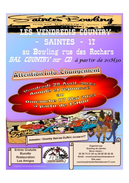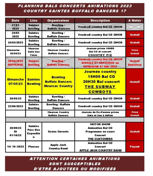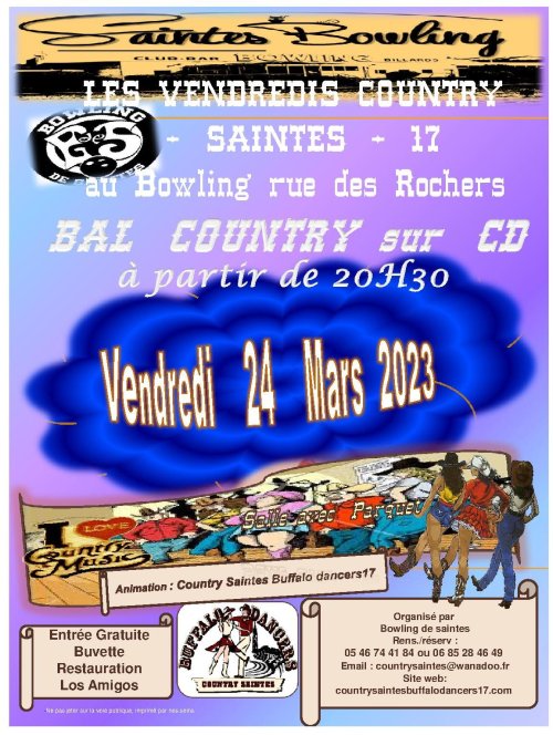 –Info du 01 Mars 2023 – Nos prochaines animations : planning complet , 3 ième vendredi country au bowling le 24 mars 2023 , soirée privée Country Meursac , buffalo & friends à meursac le dimanche 02 avril 2023 avec bal et concert Country Pie , journée country au bowling le dimanche 07 mai 2023 à partir de 15h00 bal et concert avec the Subway Cowboys , vendredi country du 28 avril 2023 annulé en raison de la proximité du 07 mai 2023 (doublon )
