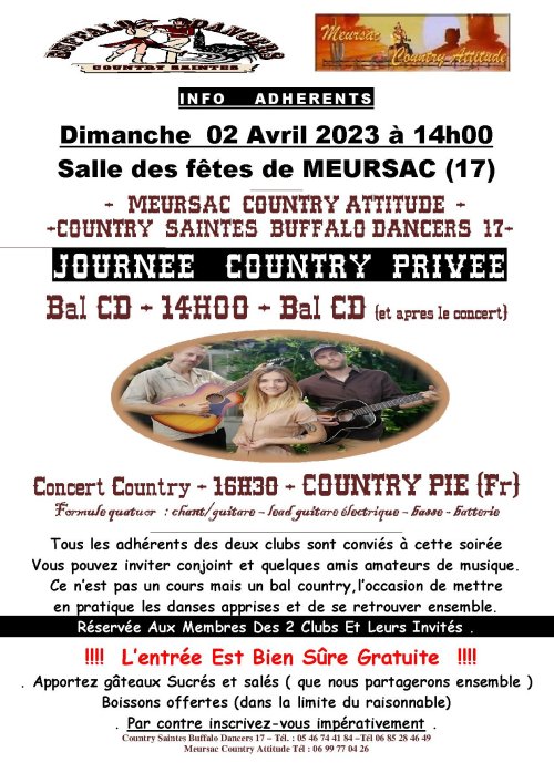 –Info du 28 Mars 2023 – N’oubliez pas les Buffalo’s ,les Meursacais ainsi que les Friends notre journée Country privée c’est dimanche 02 avril 2023 avec en concert le groupe COUNTRY PIE . Encore un bon moment en perspective