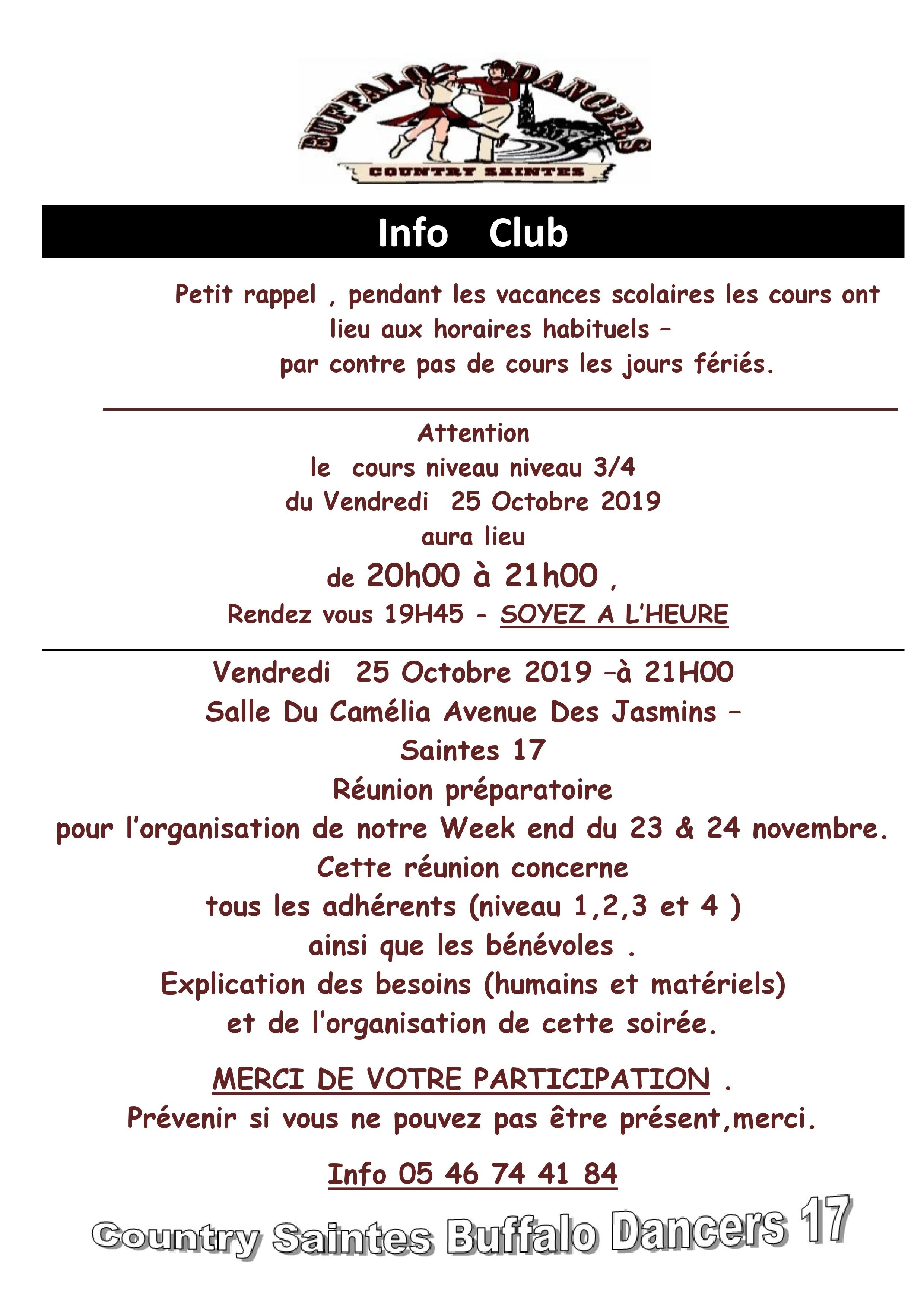 – VENDREDI 18 NOVEMBRE réunion préparatoire de 20H00 à 21H00 pour tous les adhérents des Buffalo’s Dancers pour la soirée du 26 Novembre.