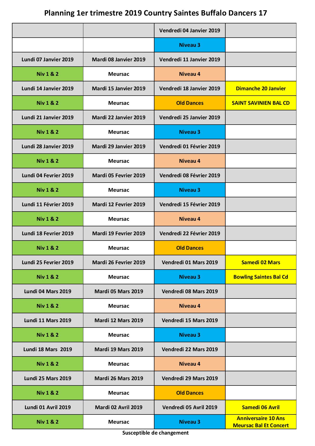 Planning des cours et animations (à compléter). Pour les cours toujours lundi et vendredi sauf si modifications indiquées dans le planning :
