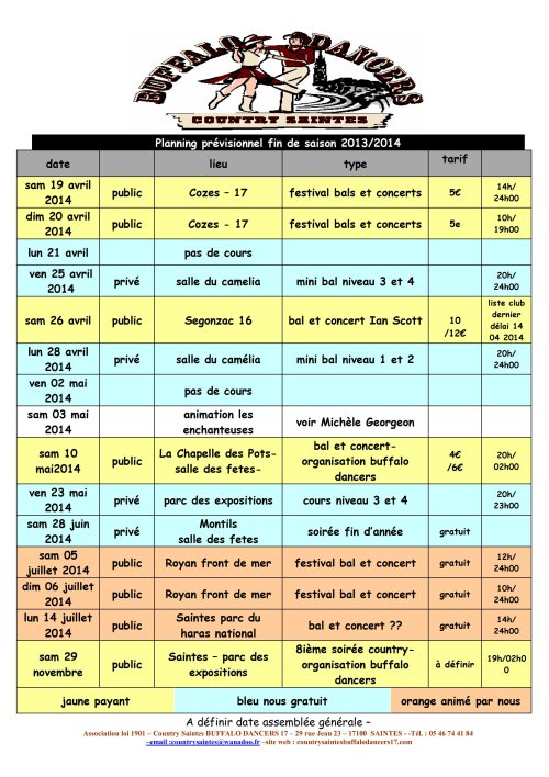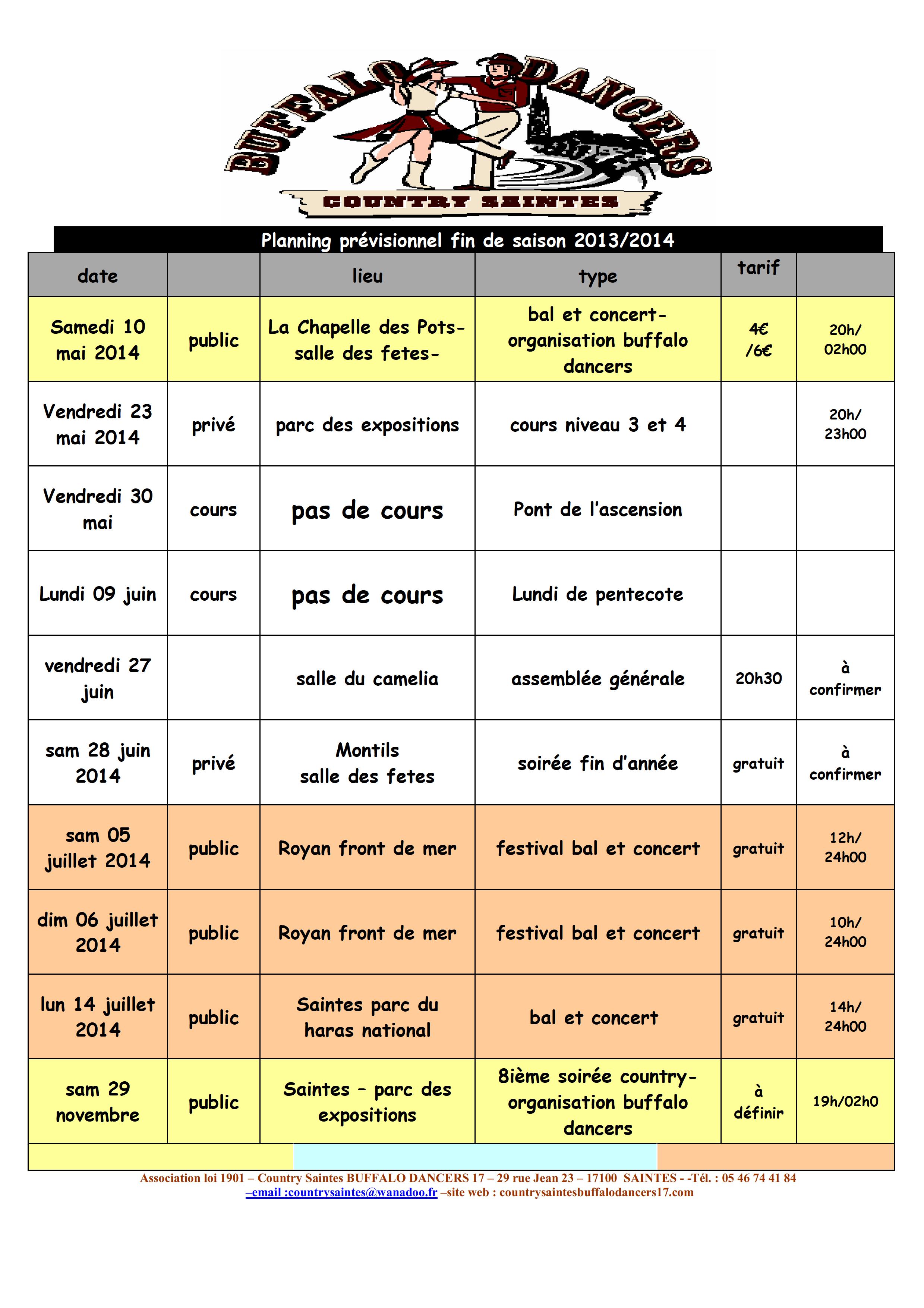 Info du 12 avril 2014 – Tableau prévisionnel des activités du club pour la fin de saison :