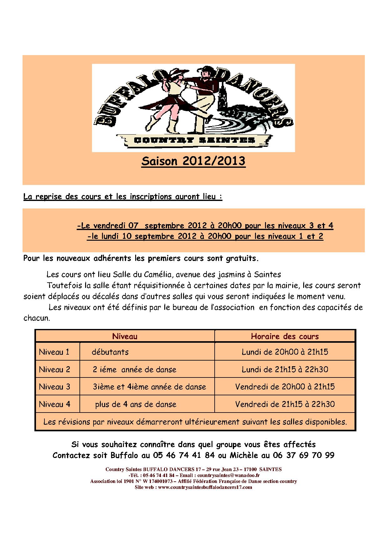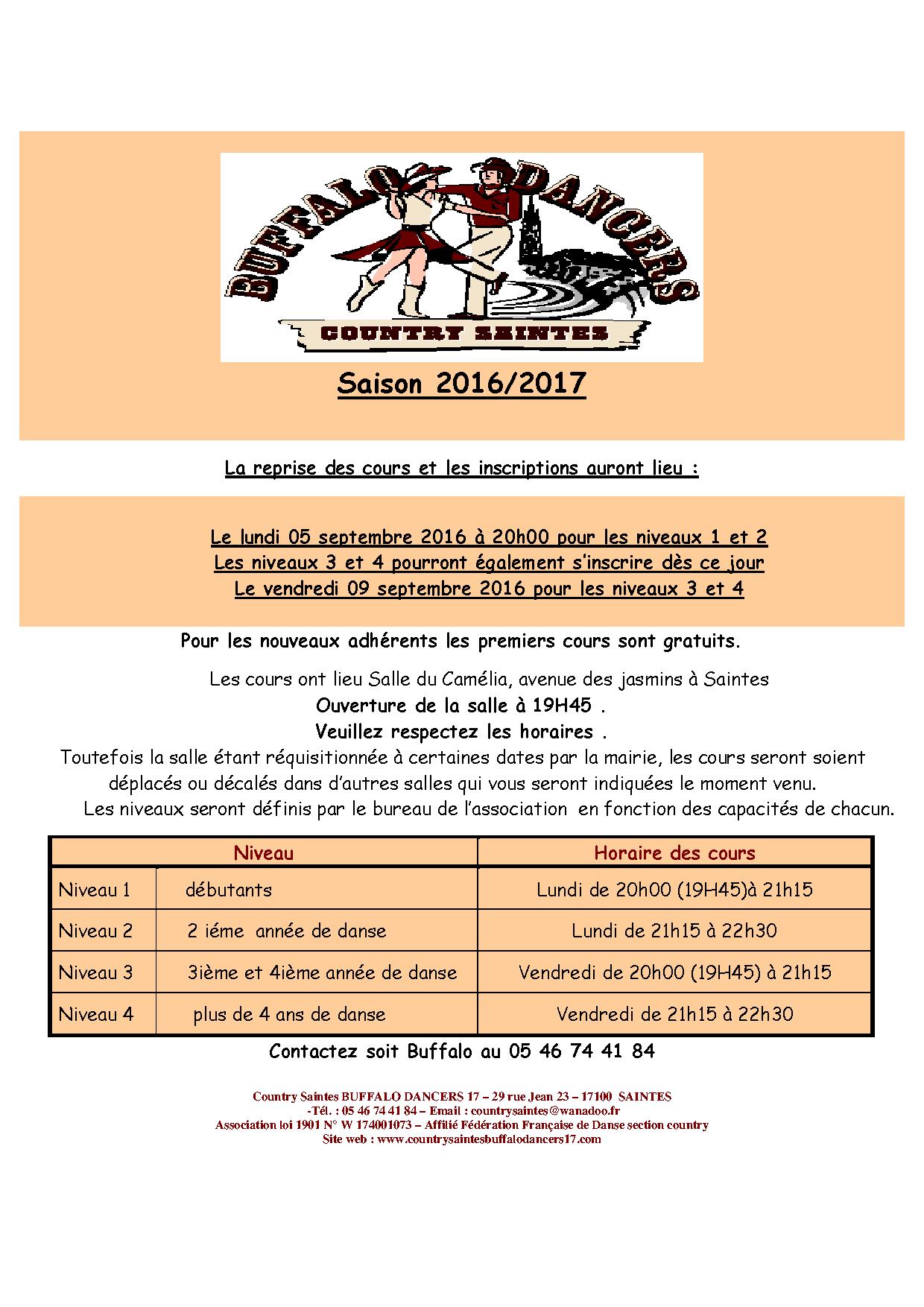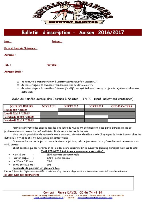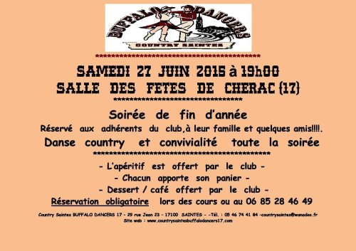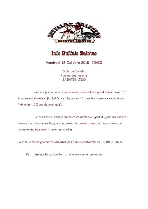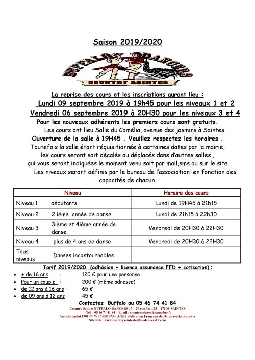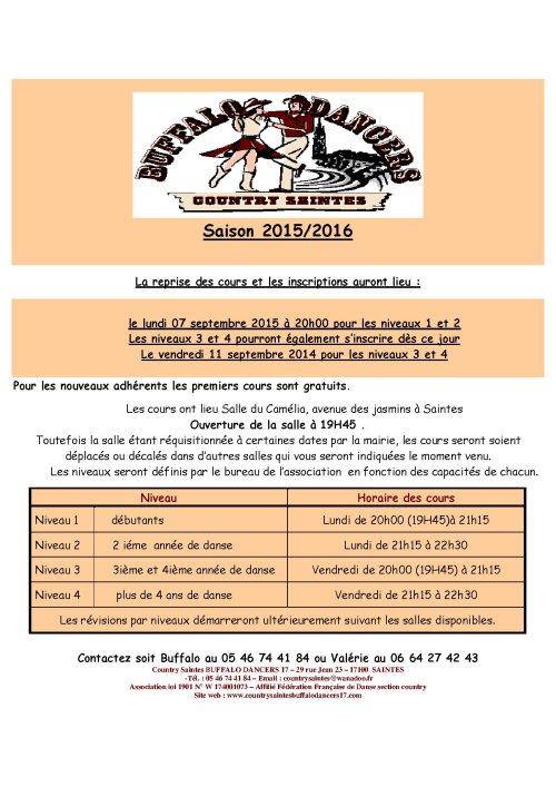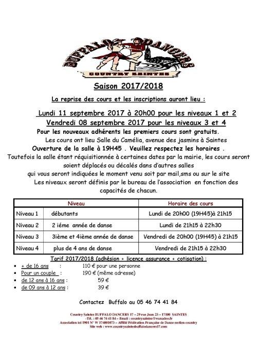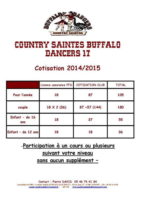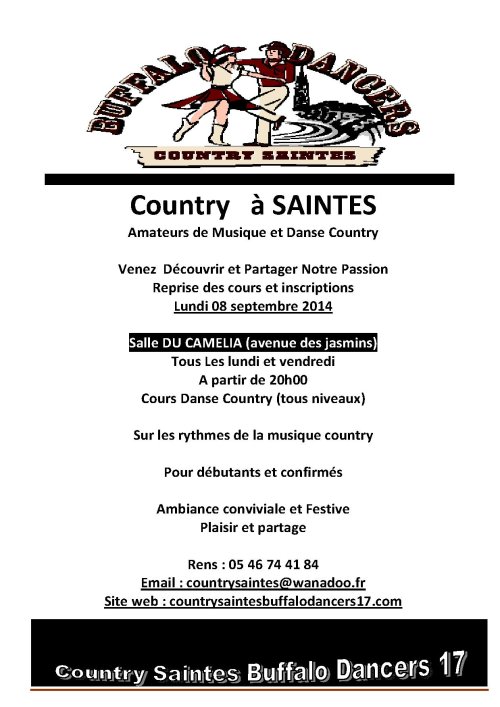 Association loi 1901 – Country Saintes BUFFALO DANCERS 17 – 29 rue Jean 23 – 17100 SAINTES - -Tél. : 05 46 74 41 84 –