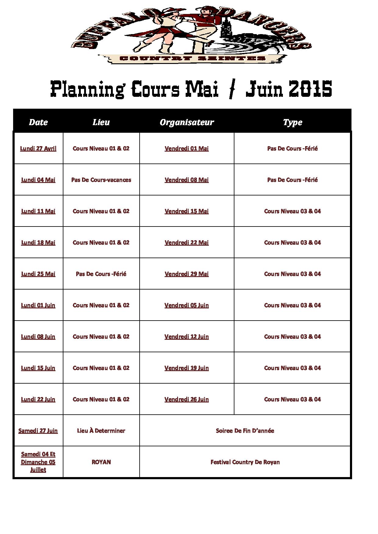 Info du 24 Avril 2015 – Planning des cours pour les mois de mai et juin 2015 :