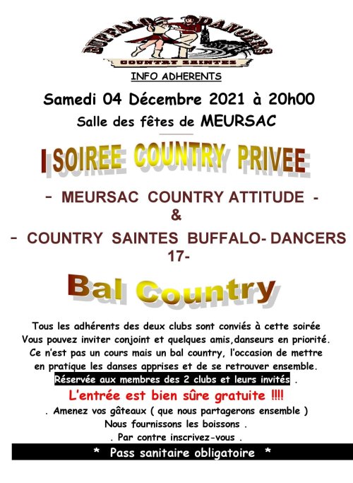 –Info du 18 novembre 2021 – Coucou les buffalo’s , petit rappel pour notre soirée privée (sous forme de bal ) conjointe avec nos amis de Meursac Country Attitude . Seulement pour vous les Buffalo’s friends et Meursacais ainsi que nos amis invités et triés avec soin .