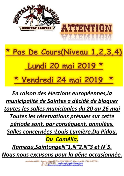 Info 20 Novembre 2015 – Attention , en raison d’une "éniéme" erreur administrative de la municipalité saintaise la salle de cours du Camélia n’est pas disponible ce soir ,en conséquence les cours niveau 3 et 4 de ce soir sont déplacées une nouvelle fois à la Salle Jean Phillipe Rameau dans la rue du même nom (comme la semaine précedente ).