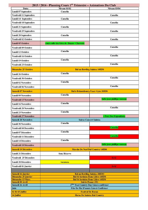Info 24 Septembre 2015 – la salle du camelia n’étant pas disponible ,les cours niveau 01 et niveau 02 du lundi 05 0ctobre auront lieu salle des fêtes de Bussac Charente (à côté du terrain de football ) aux horaires habituels . Voir fiche planning à suivre .