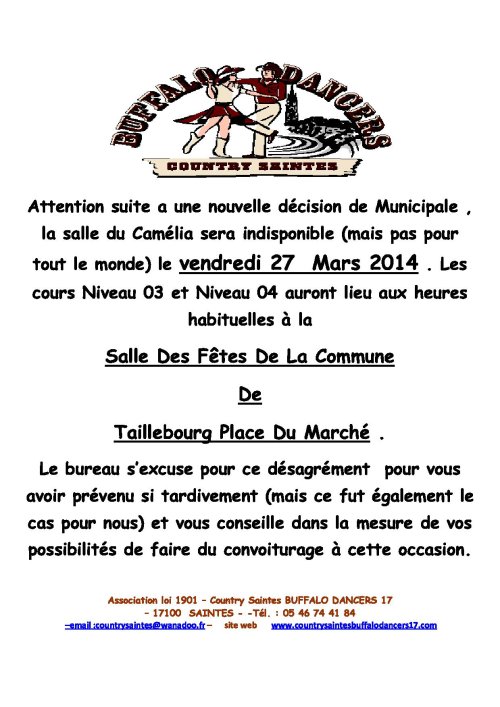 Info du 25 Mars 2015 – Changement salle le vendredi 27 Mars cours salle des fêtes de taillebourg