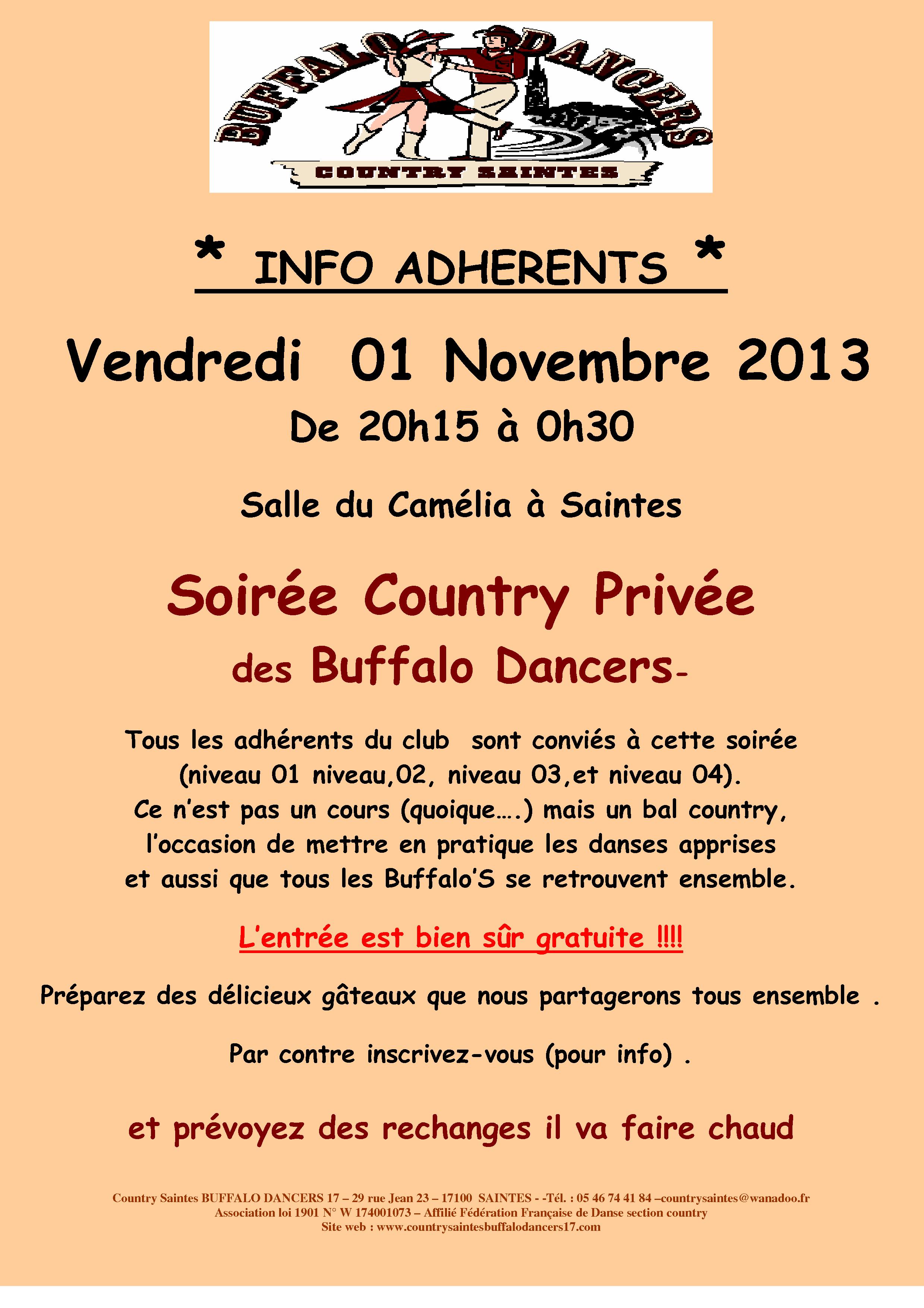 –vendredi 04 janvier 2013 : de 20h00 à 01h00 salle du camelia bal country privé pour tous les niveaux (1,2,3 et 4).