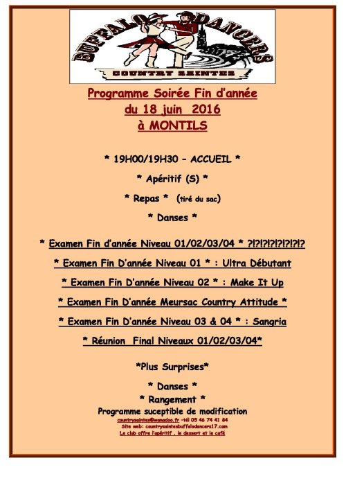 Initialement prévue à Cognac , cette soirée suite à la défaillance de l’organisateur initial , se déroulera finalement à la salle polyvalente de Port d’Envaux (à 10 kms de Saintes) et sera organisée par Country Saintes Buffalo Dancers 17.
