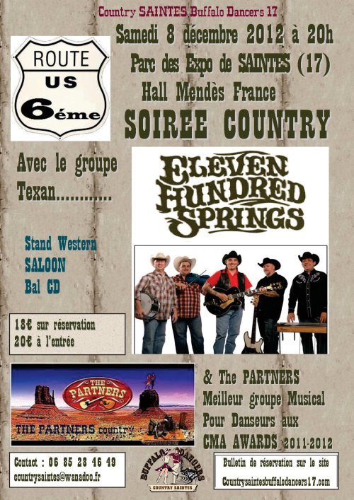Samedi 08 Décembre 2O12 -6 ième soirée Country à SAINTES avec ELEVEN HUNDRED SPRING (USA -TEXAS) et THE PARTNERs (FR)