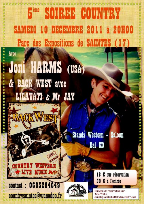 – Samedi 10 Décembre 2011 : 5ième soirée country ,parc des expositions de Saintes (17)bal et concert avec une artiste américaine : Joni HARMS mais aussi Lilavati , M. Jay et Back WEST !!!!